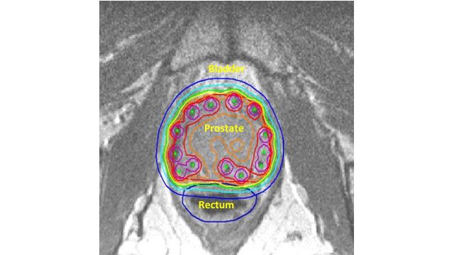Radiotherapy can also be delivered to the body internally. This can be done by implanting radioactive sources into the body in a treatment known as brachytherapy. This is a particularly effective form of treatment for some prostate cancer patients. Figure 2 shows the position of radioactive seeds (green) into the prostate gland with bladder and rectum being exposed to low levels of radiation (light blue line).