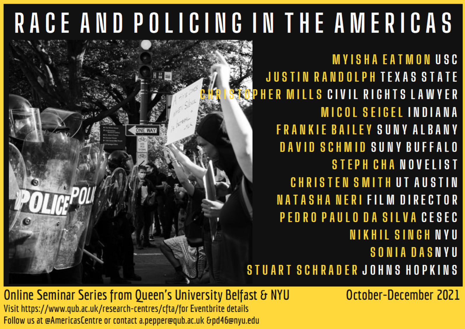 This online international seminar series, hosted by the Centre for the Americas and The Senator George J. Mitchell Institute for Global Peace, Security and Justice at Queen’s University Belfast – in conjunction with the Cultures of War research group at New York University – examines the complex relationship between race, class and policing in the Americas. One jumping off point is the police killings of black men and women in the contemporary US and Brazil which in turn brings into focus the legacies and consequences of this violence and its centrality to historical understandings of the state. Another is the various strategies of resistance employed by activists at a local, national and global level. Participants will explore these issues as a set of contemporary phenomena tied to the militarization and privatization of policing and/or as part of a longer historical continuum linked to the founding of the state and the consolidation of modern capitalism. These contributions will focus exclusively on individual states and regions or offer comparative, transnational perspectives. As well as exploring the complex entanglements between race, class, policing, capital and the state historically and in the contemporary, participants may explore the representation of these entanglements in fiction and non-fiction and consider how effectively particular genres can interrogate the problem of racialised policing and agitate for wider social justice and political change.
