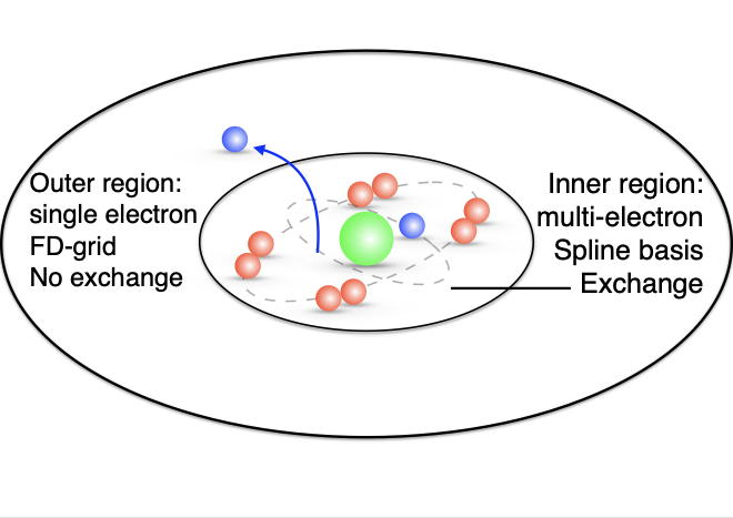 As with other R-matrix approaches, RMT is based on the idea of the division of space. In an inner region, close to the nucleus, multi-electron correlations including exchange are described in full detail. We assume that a single electron can be ionised, and thus in an outer region far from the nucleus, we describe this single electron moving in the long-range potential of the residual ion and neglect electron-exchange. This allows the time-dependent Schrödinger equation to be solved in a large region of space by confining the computationally intensive electron exchange calculations to a relatively small region. Thus we have an inner region which is small but computationally arduous, and an outer region which is relatively less intensive, but quite large.