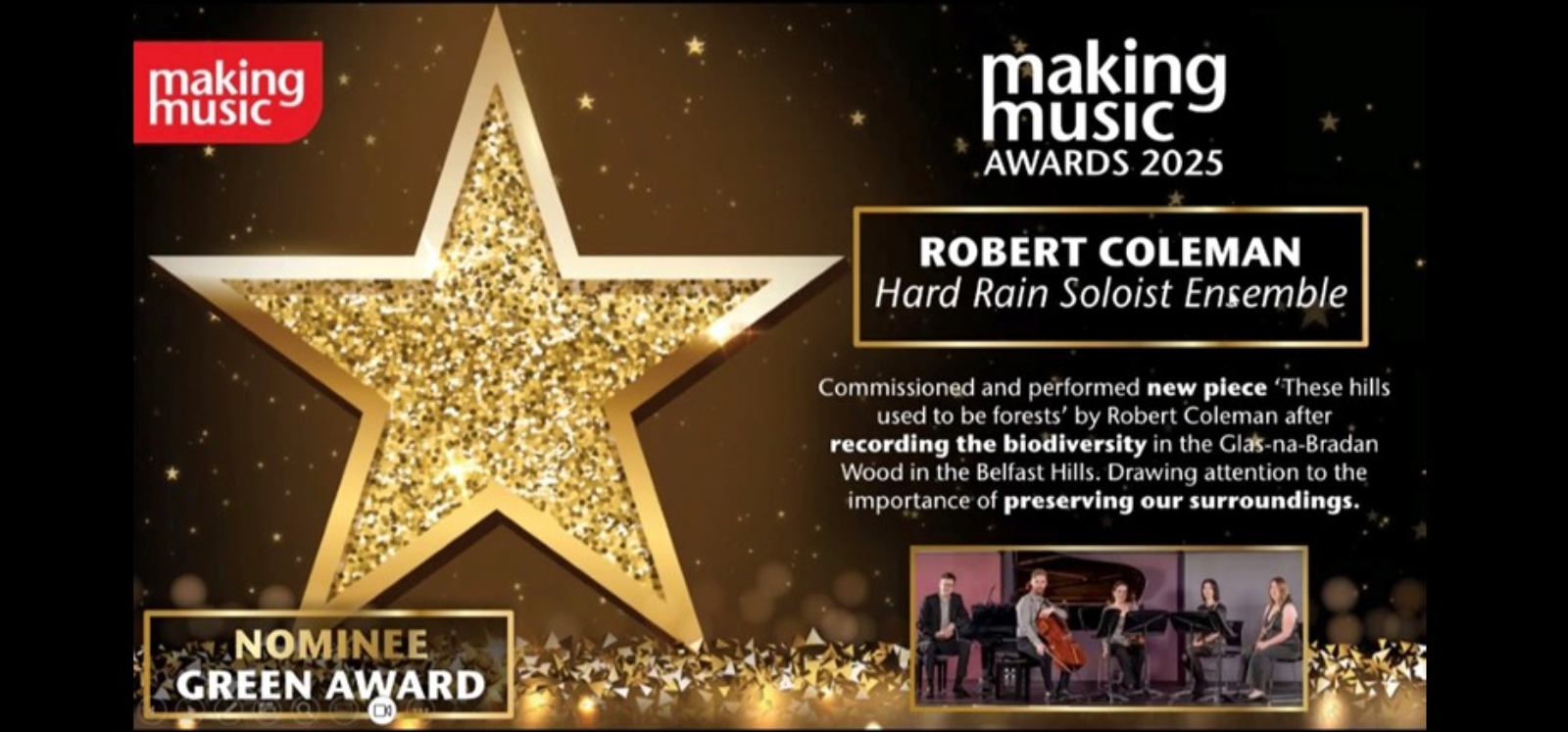 Robert Coleman's work 'These hills used to be forests' for Hard Rain Soloist Ensemble was shortlisted for the Making Music Green Award 2025