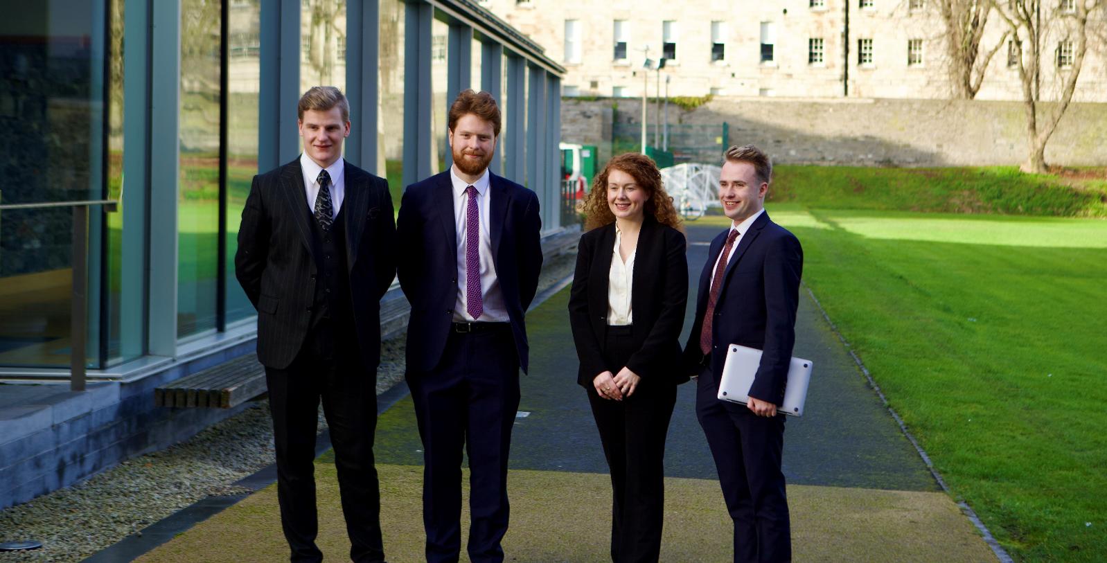 Robert Bellingham, Leah Taylor, Daniel Spence and Thomas Stewart (coach) participating in the International Environmental Moot Competition hosted by the Law Society of Ireland, Blackhall Place, Dublin.