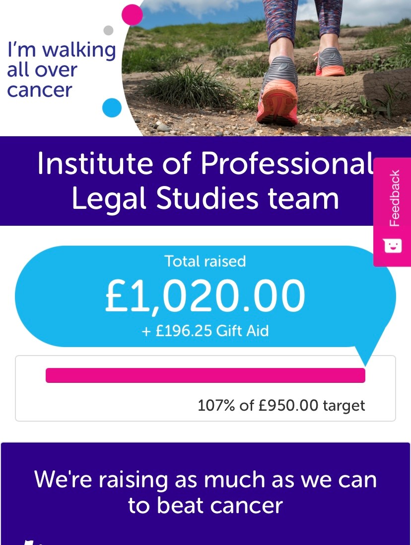 Great work from 5 of our trainee solicitors at the IPLS who raised £1020 for Cancer Research. Teams members Heather Burton, Jamie Donnelly, Rebecca Coyle, Mark McKenna and Naomi White managed to each walk 10,000 steps a day for a whole month.