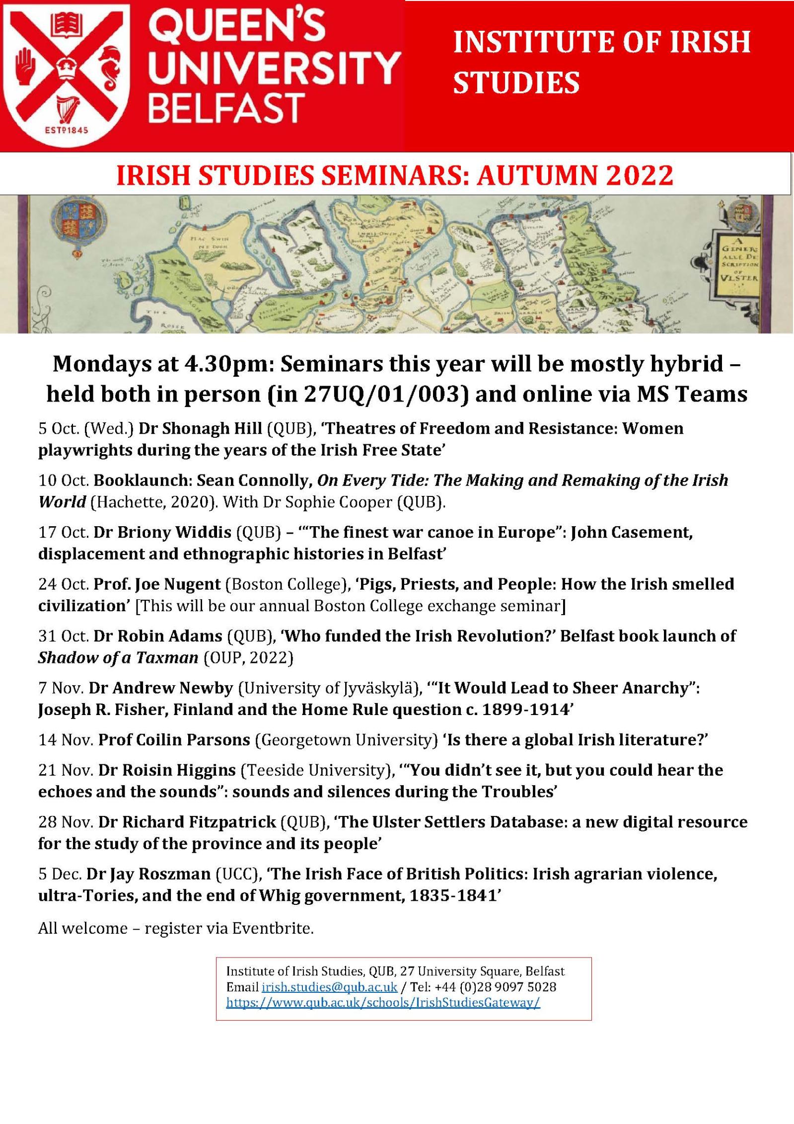 Our Autumn 2022 seminars are hybrid - in person and online via MS Teams. Full listings are at https://www.qub.ac.uk/schools/IrishStudiesGateway/NewsandEvents/