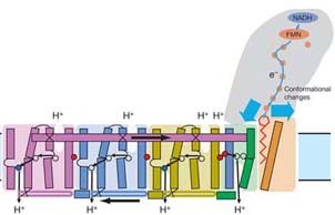 Conformational coupling between electron transfer and proton translocation is mediated by helix HL (cytoplasmic side) and the βH element (periplasmic side). A four protons per cycle are translocated per one molecule of NADH oxidised