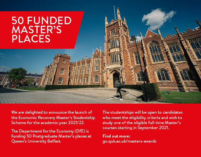 The NI Department for the Economy (DfE) has annouced the Economic Recovery Master's Studentship Scheme for the academic year 2021/22. 50 funded places will now be available across Queen's University Belfast. If you meet the eligibility criteria, you could study our Advanced Food Safety, Molecular Biology and Biotechnology, or Parasitology and Pathogen Biology programmes with an awards to cover payment of tuition fees and a £10,000 per annum stipend paid monthly.