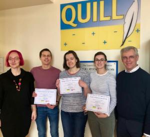 The meeting included a showcase of research from both industrial guests (B9 Energy Storage, Certech, Johnson Matthey, Kilwaughter Minerals, Trifol) and QUILL researchers, and poster presentations from all QUILL students and postdoctoral researchers. Prizes were awarded to Lucy Brown (best presentation, best poster), Emily Bryne (presentation runner up) and Peter McNeice (poster runner up).