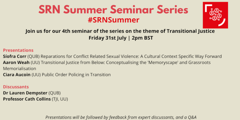 This is the fourth installment of the SRN Summer Seminar Series on the theme of Transitional Justice. The event will include three presentations by PhD candidates from UU and QUB, followed by feedback from the discussants and a Q&A session with the public.