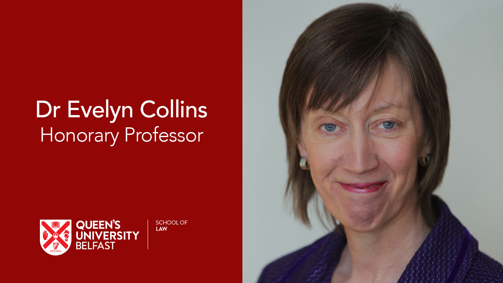 We are pleased to announce that Dr Evelyn Collins, CBE, has been appointed as an Honorary Professor at the School of Law at Queens University.