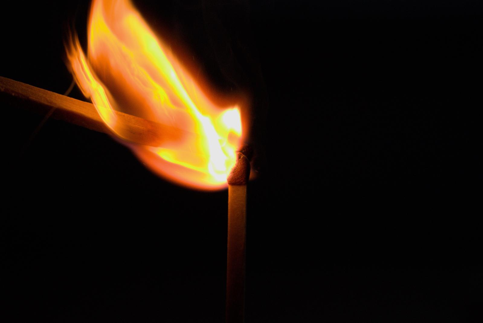 Pictured here is a lit match lighting another unlit match. The heat from the first match is enough energy to kickstart the reaction of the potassium chlorate in the head of the match with oxygen in the air. This initial reaction lights the paraffin-soaked wooden stick of the match allowing a small, sustained flame.