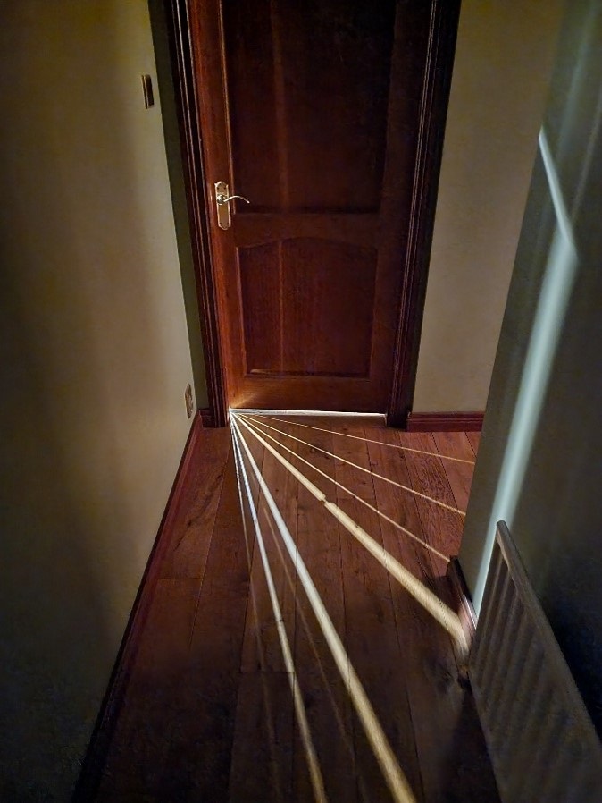This picture shows what I had first thought to be the lights from the kitchen ceiling diffracting through the gap in the doorway and forming a diffraction pattern on the floor. However, upon closer inspection I realised this was not the case.