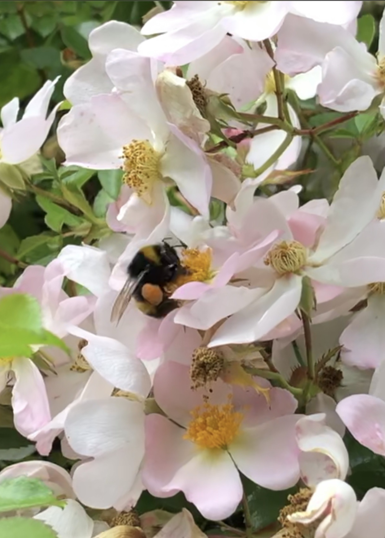 This is a photo of a bumblebee foraging on Dog Rose.