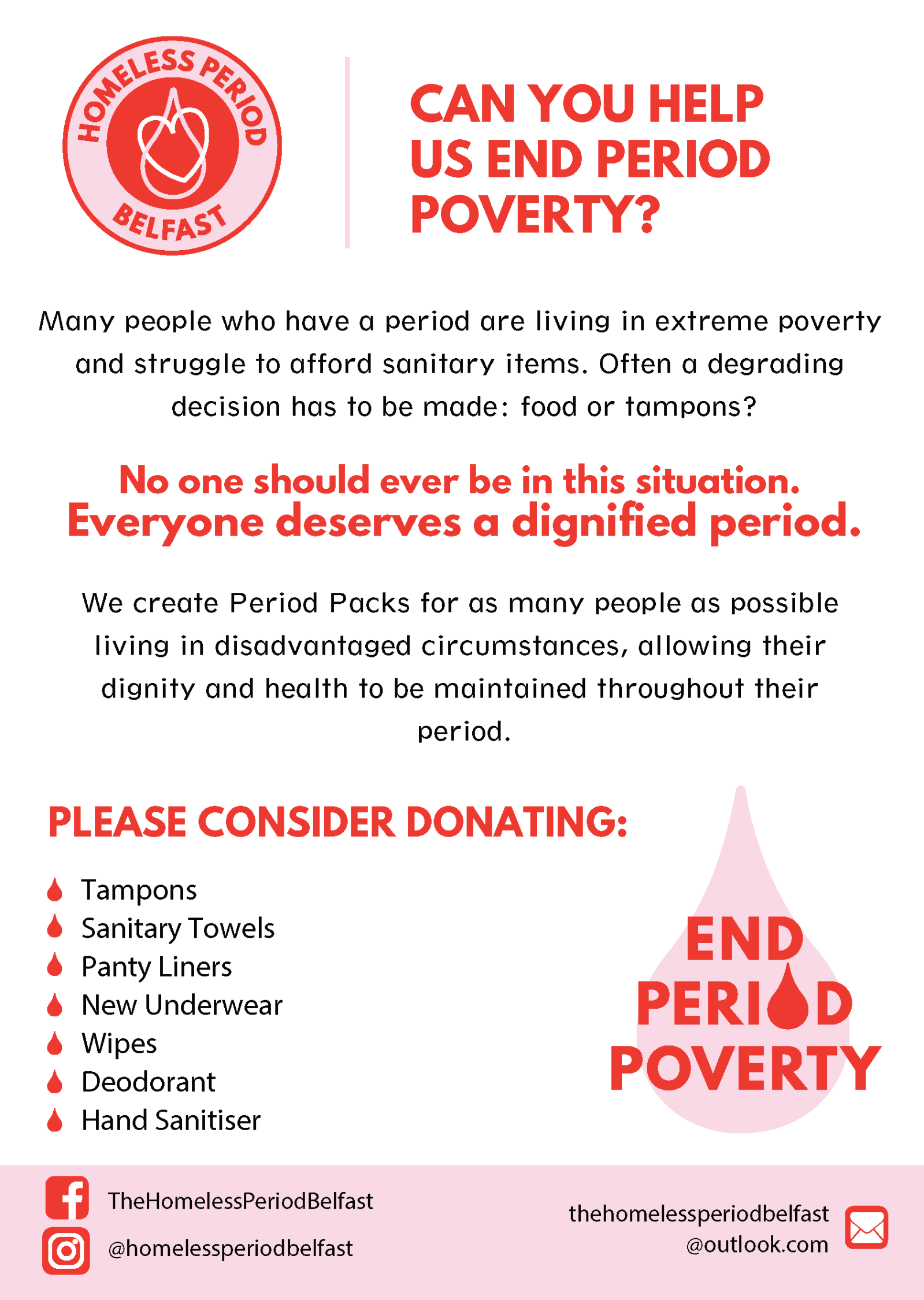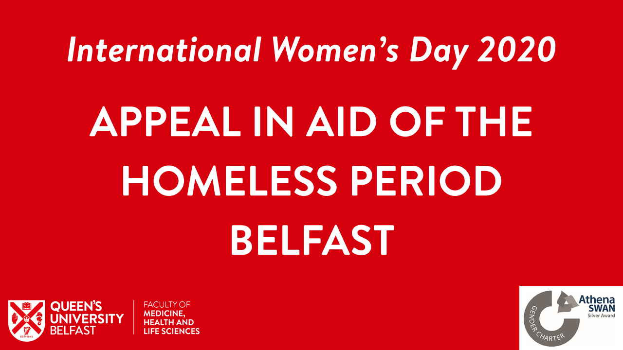 As we celebrate International Women's Day 2020, the FMHLS Athena SWAN Committee seeks support with the collection of sanitary items for the ‘End Period Poverty’ campaign in aid of the Homeless Period Belfast.