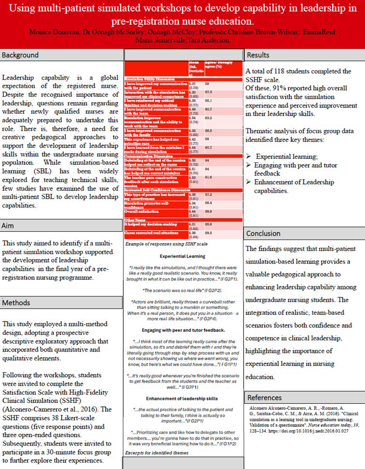 The team was recognised for the innovative use of simulation-based learning (SBL) to embed leadership capabilities- delegation, prioritisation, communication, and decision-making skills- within the nursing curriculum. Authentic scenarios were co-designed with students, staff, and PCEP to enhance experiential learning and professional readiness. The module has reached over 1,000 nursing students, with evidence of improved confidence, teamwork, and clinical competence. Underpinned by research design, the project has been disseminated nationally and internationally through conference presentations and a forthcoming publication, demonstrating leadership and excellence in advancing professional nursing education through innovative, evidence-based teaching practice.