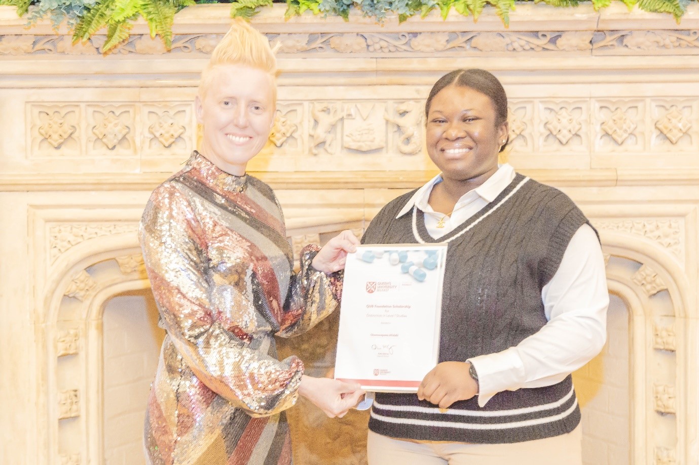 Oluwamayowa Afolabi, winner of the QUB Foundation Scholarship for Distinction in Level 1 BSc Studies, receiving her award from Guest of Honour, Professor Claire Thompson