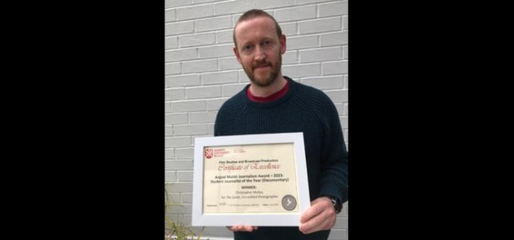 Christopher Molloy, MA Film student, wins Young Journalist of the Year - Anjool Malde Awards 2023 (co-hosts Queen's University Belfast) for his short film The Quiet, Uncredited Photographer