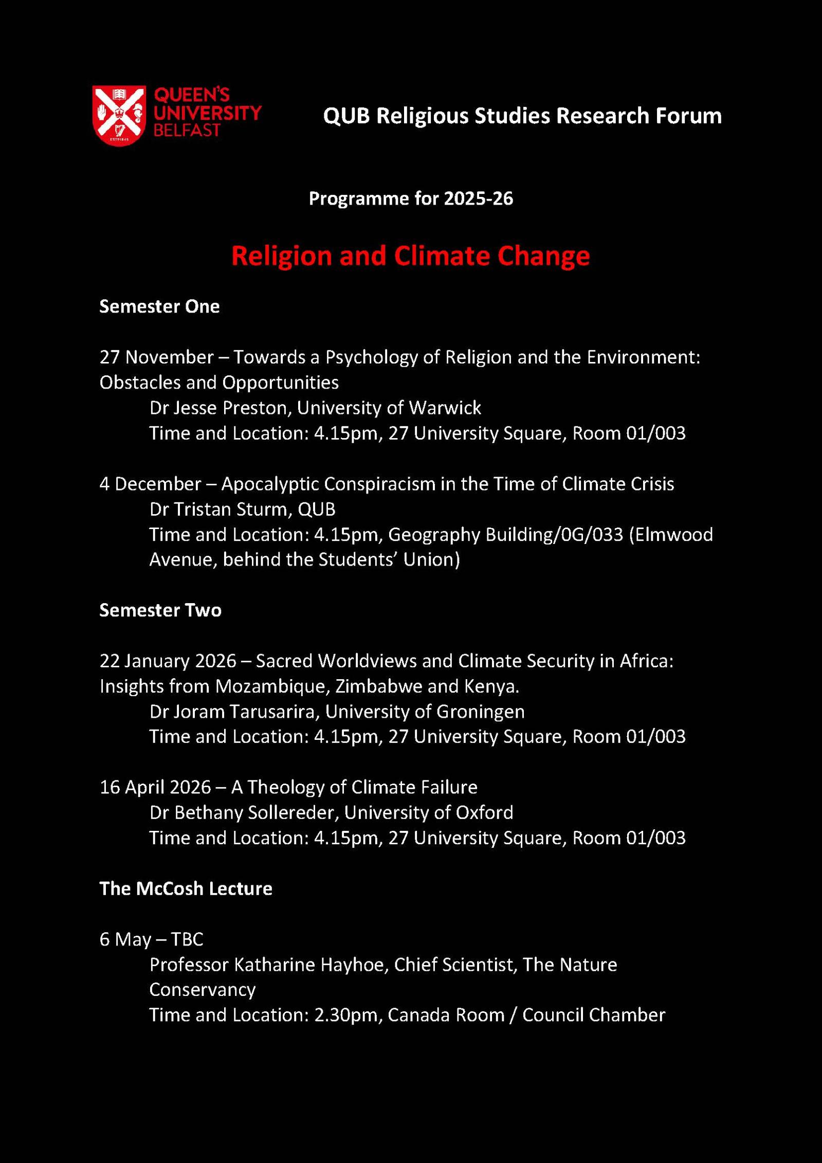 The Queen's University Belfast Religious Studies Research Forum is an interdisciplinary grouping of scholars from across the University interested in exploring themes and issues relating to religion in culture and society. The Forum sponsors the annual McCosh lecture, delivered in recent years by Onora O'Neill (2019), David Hempton (2020), Sarah Coakley (2021), Colin Kidd (2022), David Livingstone (2023), Mary Daly (2024) and Irene Tracey (2025). It also organises an annual series of research seminars in the University but open to the public.