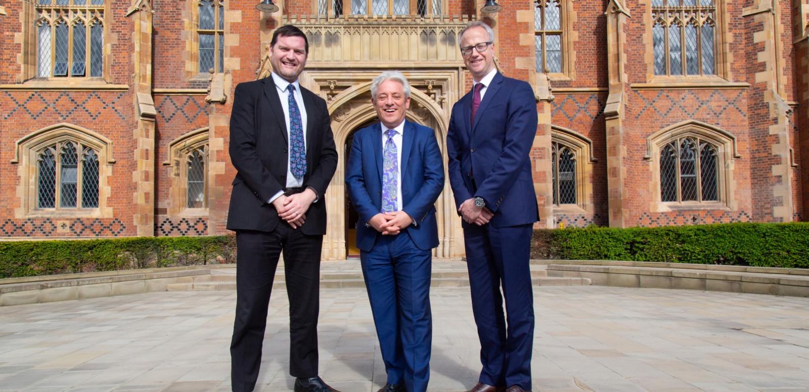 Caption (L-R): Alistair Stewart, Acting Head of Public Engagement at Queen's; The Right Honorable John Bercow, MP and Professor Alister Miskimmon.