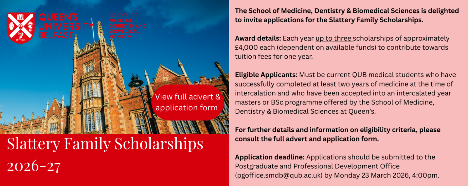 We anticipate that additional scholarships will become available to QUB medical students applying to undertake an intercalated BSc or Postgraduate taught degree in the School of Medicine, Dentistry & Biomedical Sciences at QUB. Further information and a closing date will be circulated to eligible applicants as it becomes available.