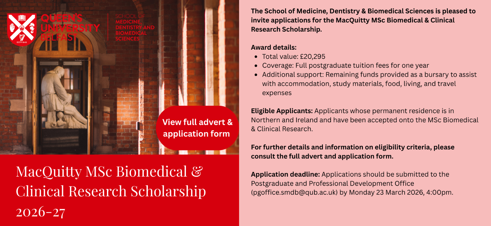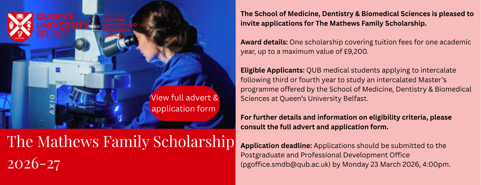 We anticipate that additional scholarships will become available to QUB medical students applying to undertake an intercalated BSc or Postgraduate taught degree in the School of Medicine, Dentistry & Biomedical Sciences at QUB. Further information will be circulated to eligible applicants as it becomes available.