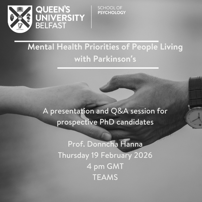 Please join Professor Donncha Hanna for a short informal discussion about the fully funded PhD project: Mental Health Priorities of People Living with Parkinson’s at Queen’s University. There will be a chance to ask any questions you may have. If you are interested, please join the Teams meeting using the link below at Thursday the 19th of February at 4pm.