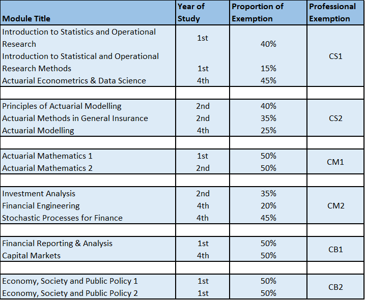 The IFoA has granted our degree programme exemption from six of the Core Principle subjects of the professional exams. In order to get the six exemptions students have to meet a certain level in their studies the details of which are set out below: