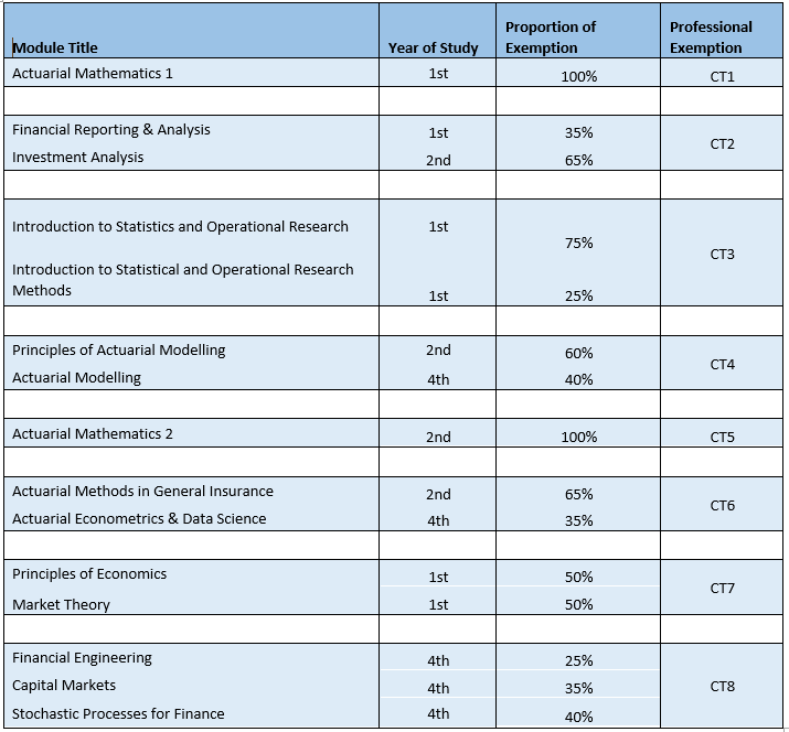 The IFoA has granted our degree programme exemption from six of the Core Principle subjects of the professional exams. In order to get the six exemptions students have to meet a certain level in their studies the details of which are set out below: