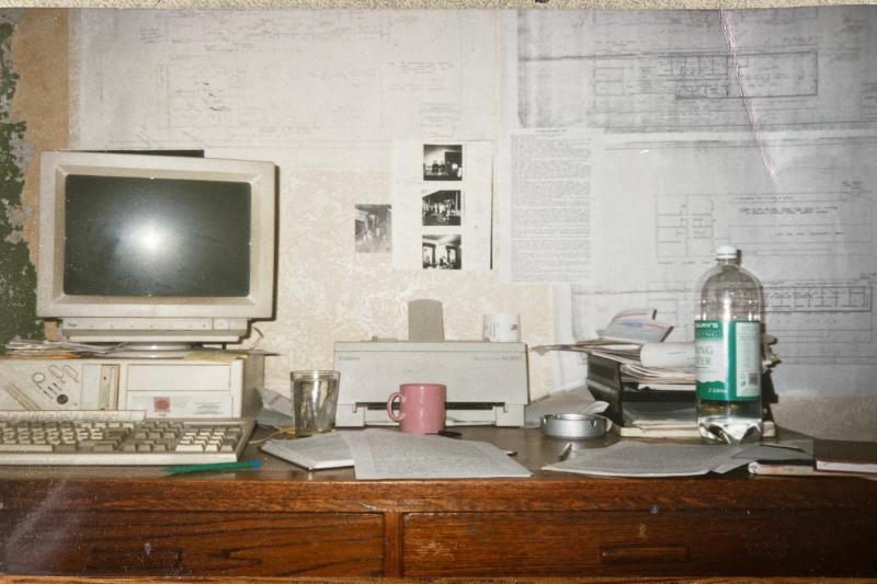 That? It’s a photo of the room I worked in when I was writing my fourth novel, The International. So, taken some time in the second half of the 1990s. I had started to strip the wallpaper, but never got around to finishing. (Writing novels can be hard, but it is nothing compared to stripping wallpaper.) The rest of the wall is covered with floor plans of the International Hotel, where the novel is set, and photographs of people attending functions there in the mid 1960s. I wanted one of the photos for the cover of the book, but it featured an aunt of the person who gave it to me (she looked like one of my aunts, that’s part of why I liked it), and he was worried, after he read the manuscript, that a couple of the passages would have had her turning in her grave. The thing next to that is a drawing my younger daughter did of me three summers ago at the gates of Strawberry Fields.