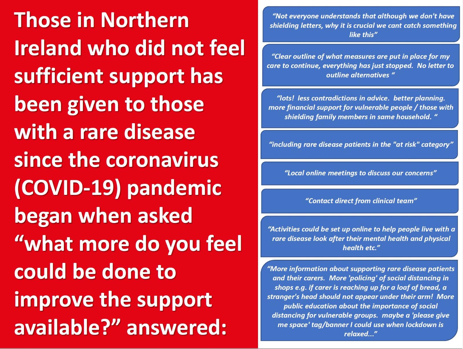 In the interests of sharing as much information as early as possible, we have conducted an interim analysis on a subset of data and presented those results to the Northern Ireland Rare Disease Partnership in the first instance. These interim findings are freely available: IMPaCCT_RareDisease. While some people living with rare diseases highlighted that social distancing provided an opportunity to get jobs done and learn new hobbies, other people explained it was no different to the normal day-to-day isolation they experience with their rare disease. More negative responses included the majority of respondents concerned about their jobs and finances, lack of understanding about COVID-19 guidelines for clinically vulnerable individuals, significantly increased caring responsibilities / needs, decreasing independence, difficulties sourcing essential PPE, medicines, and groceries, challenges interacting with medical professionals and decreased access to medical and social care, as well as concerns about the restrictions due to COVID-19 lifting. 15 people said that COVID-19 had a positive impact on their lives, with 79 reporting no change, and 180 describing a negative impact.