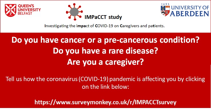 Researchers at Queen’s University Belfast and the University of Aberdeen, invite you to take part in an online research study investigating the impact of the COVID-19 (coronavirus) pandemic on caregivers and patients with cancer, pre-cancerous conditions and rare diseases.