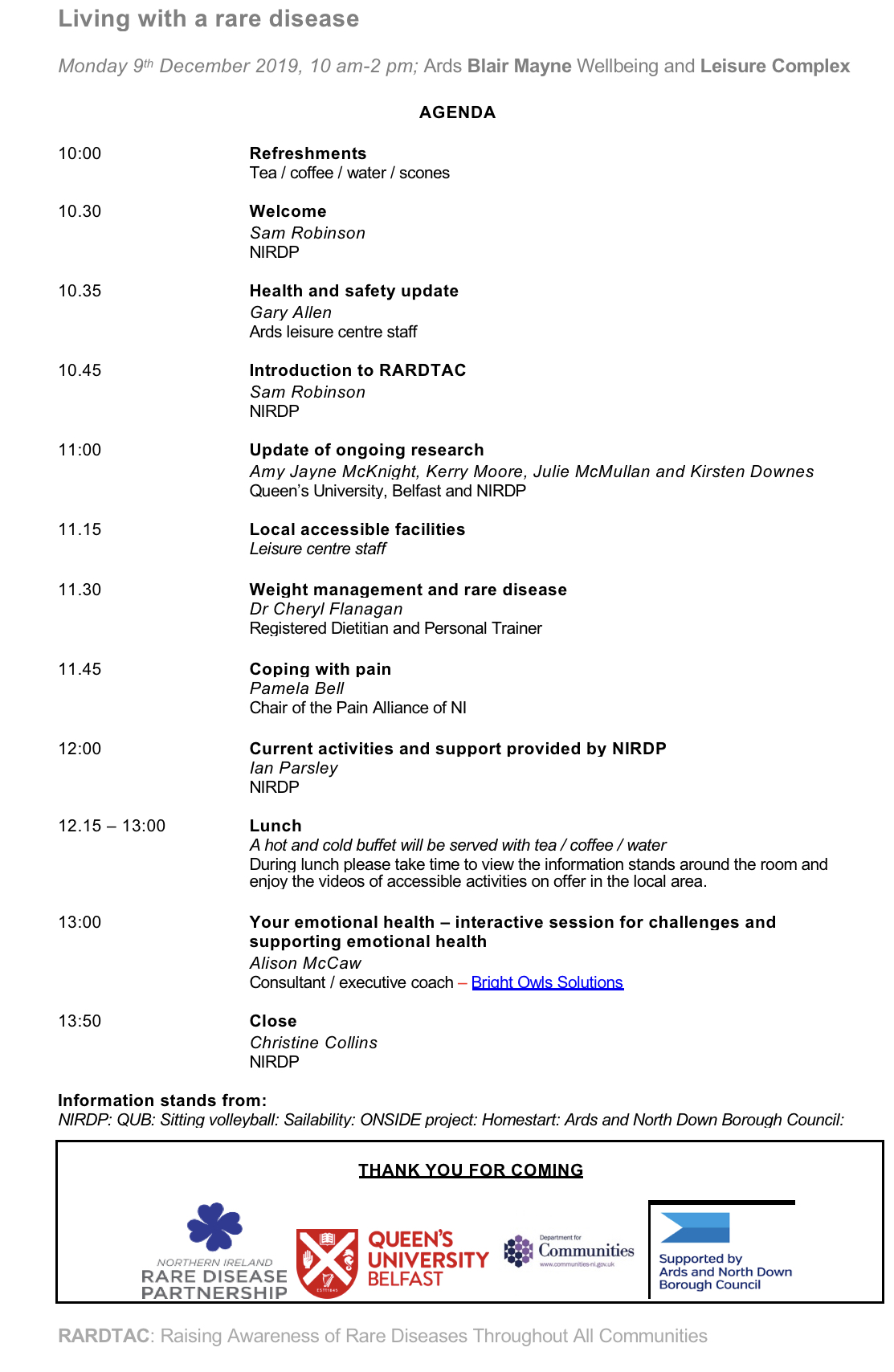 We're delighted to host this RARDTAC event with NIRDP. All welcome - please come along and meet others living with rare conditions, hear about leisure activities, weight matters, pain management, NIRDP support, & maximising emotional health.