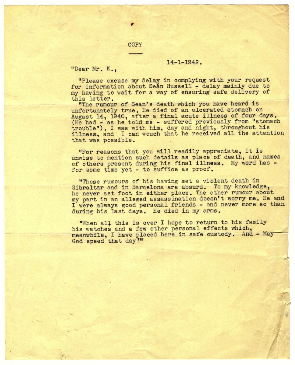 Despite the ideological differences between Ryan and Russell during the 1930s, both men agreed that German support should be utilised to advance Irish republican objectives. Document 7 (a letter from Ryan to Kerney) outlines the circumstances of Russell’s death in 1940.