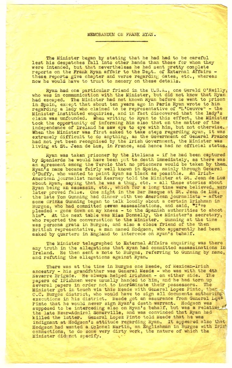 Source: Memo on Frank Ryan by Colonel Dan Bryan of an interview with Leopold Kerney, Dublin, 20 October 1941, NAI DFA Secretary’s files A20/4 (courtesy of National Archives of Ireland).