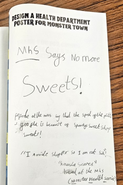 We held our public event on Halloween, and children aged 7-12 were invited to join us. The event was co-hosted with the Administrative Data Research Centre Northern Ireland, and both research teams dressed to impress (and scare). The children were guided through a series of activities designed to help them understand how we collect data, how we analyse data, and how data is used to make decisions to improve public health. All of the table activities centred around our fictional town – MonsterTown – and one creative young person drew a health poster for the MHS, the MonsterTown Health Service.