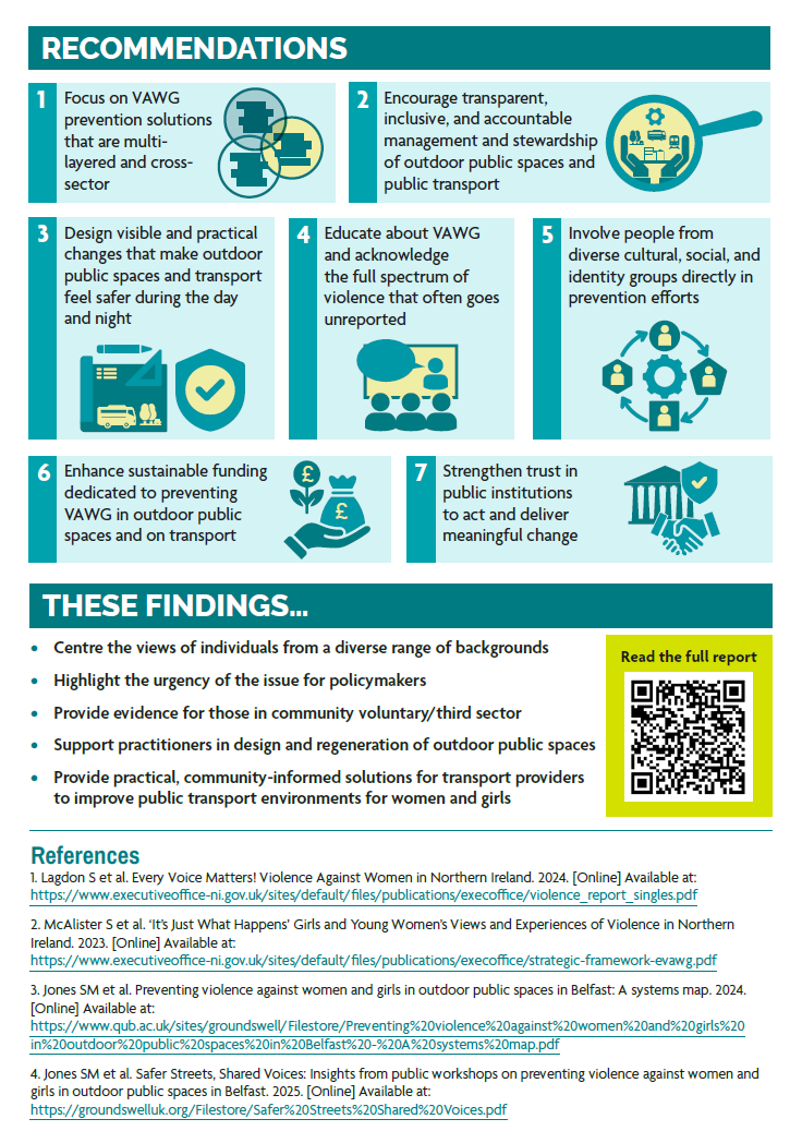 This report brings forward the perspectives of people from across Belfast, from a wide range of backgrounds, and provides recommendations for preventing Violence Against Women and Girls (VAWG) in outdoor public spaces.