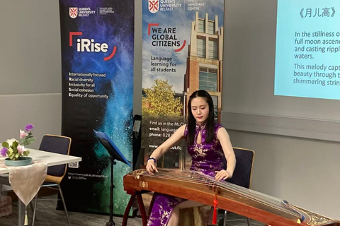 The programme opened with a graceful guzheng performance of Moon Rising High by PhD candidate Li Fei, followed by welcomes from Thomas Smith (Language Centre Manager) and Dr Bee-Yen Toh (iRise Co-Chair). Representatives from Queen’s Students’ Union—Mórrigan McEvoy (Student Officer for Accessible Education) and Claudia Liu (Chair of the International Students’ Association)—highlighted how the Union supports a student body representing 80+ countries and regions. A cultural display led by Li Fei featured a traditional tea and incense ceremony, while student volunteer Shiuh Ting Gho delighted guests with beautifully penned festival greetings in calligraphy.