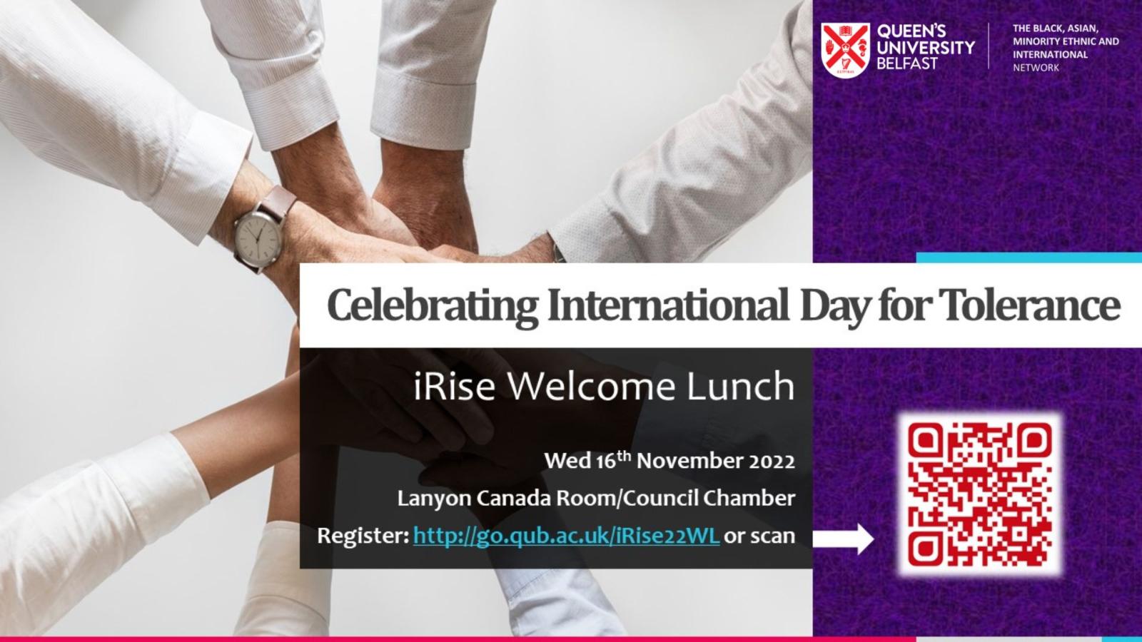 The iRise and Diversity and Inclusion Unit invite Queen’s colleagues to join our welcome lunch to celebrate the International Day for Tolerance on Wednesday 16th November. This is a good opportunity for existing and new iRise members, as well as local colleagues, to socialise and network with each other, sharing experiences of living in Belfast and elsewhere in a social, friendly and fun way.
