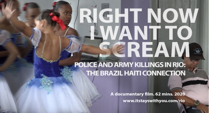 The film Right Now I Want to Scream: Police and Army Killings in Rio - the Brazil Haiti Connection (2020) was produced using participatory practices in collaboration with mothers whose children have been killed during police operations in Complexo do Alemão, Manguihos, Complexo de Maré; and Salgueira.