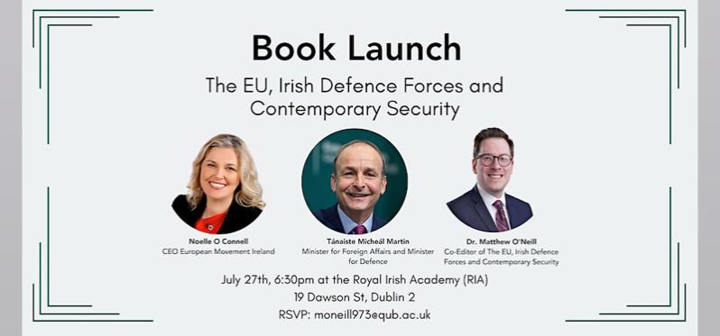 The event includes an introduction from Tánaiste Micheál Martin T.D. and contributions from Noelle O’Connell, CEO of European Movement Ireland and co-editor of the book Dr Matthew O’Neill.