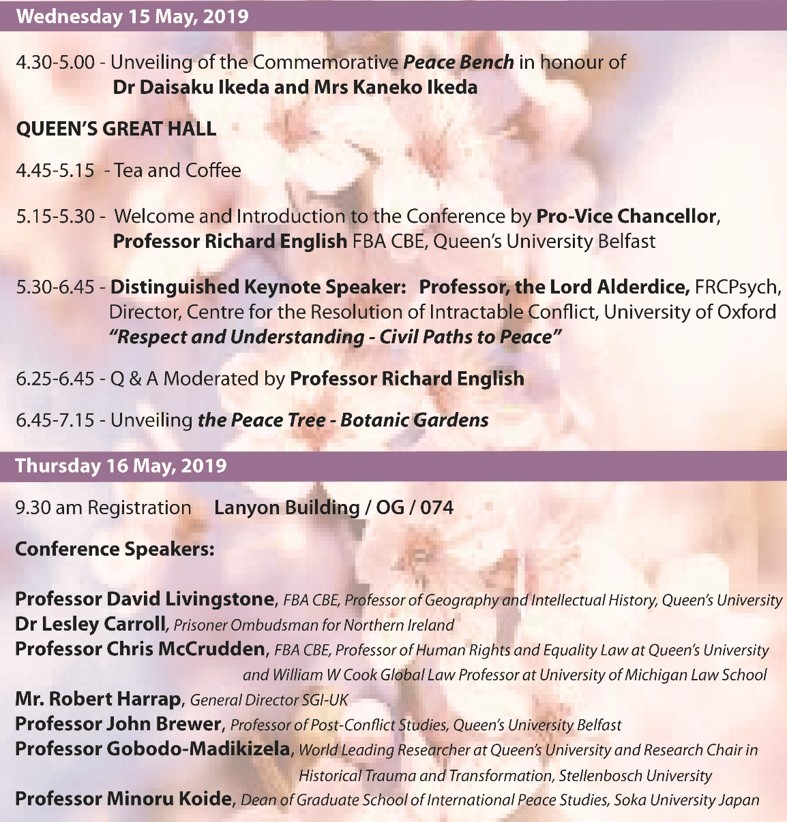 This event is jointly hosted by the Senator George J. Mitchell Institute for Global Peace, Security and Justice, the British Council NI, Belfast City Council and SGI-UK. It will bring specialists from Japan, Bonn, Northern Ireland, Republic of Ireland and UK.