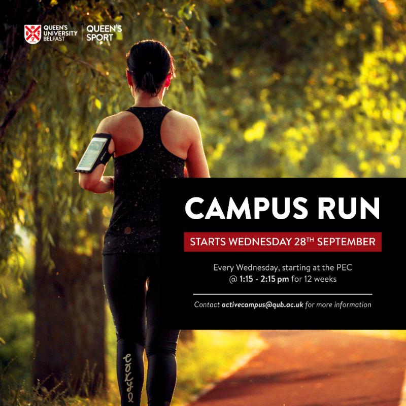 Join the campus run each week. It will run every Wednesday at 1.15pm outside the PEC for the whole semester. You have the option to run 3km or 5km as part of a group. This is a drop-in programme so no need to sign up.