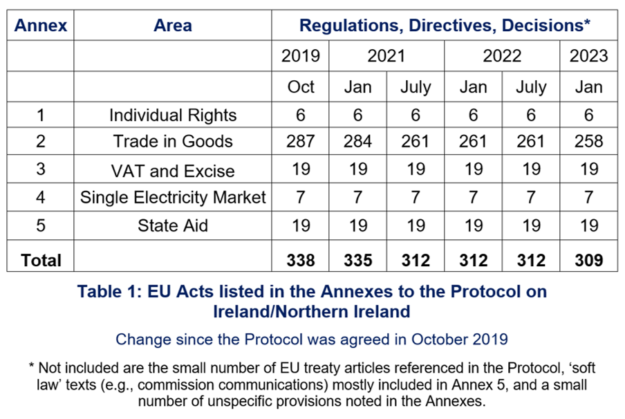 Considering all these changes alongside those agreed to date by the Joint Committee, the number of EU acts that apply in post-Brexit Northern Ireland has decreased since the Protocol entered into force. As of 1 January 2023, there are now 308 EU regulations, directives and decisions that apply; 30 less than when the Protocol was first agreed in October 2019 (see Table 1). The decrease is essentially due, however, to the consolidation in a single replacement act of several previous acts and not a decrease in the scope of the Protocol.