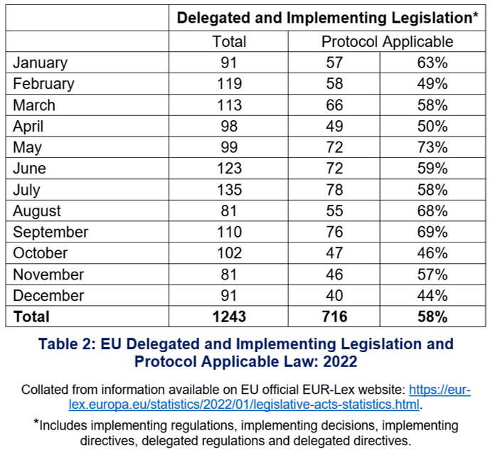 EU implementing legislation – including that applicable under the Protocol – is regularly adopted by either the Commission or the Council. In 2022, the EU adopted 1243 pieces of implementing legislation. Not all of these apply to Northern Ireland under the Protocol. Of the 1243 implementing acts adopted, 716 (representing 58%) were within the scope of the Protocol (see Table 2).