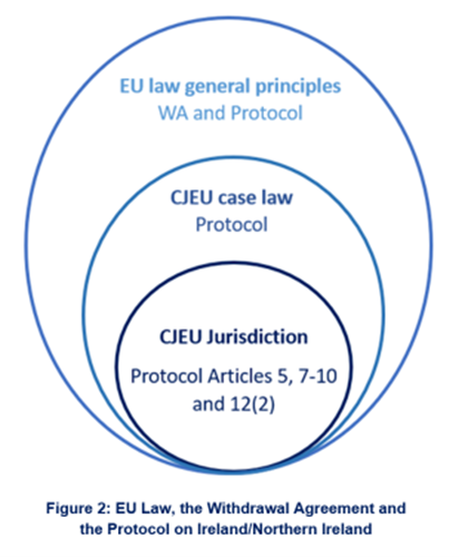 Thus, Article 4 of the WA explicitly provides for the continuation of the principles of direct effect, supremacy, and general principles of EU law in relation to the WA in its entirety, including the Protocol and those EU instruments that fall within its scope; Article 4 of the WA does not, however, make provision for continued CJEU jurisdiction. By contrast, Article 12(4) of the Protocol does provide that full CJEU jurisdiction is retained but (only) as regards the implementation of Article 5 and Articles 7-10 of the Protocol with Article 267 of the TFEU applying to the UK for this purpose. Alongside this, Article 13(2) of the Protocol provides that ‘the provisions of this Protocol referring to Union law or concepts or provisions thereof shall in their implementation and application be interpreted in conformity with the relevant case law’ of the CJEU. There are, therefore, three levels to the ongoing relationship between EU law proceedings and different aspects of the WA, including the Protocol, set up under its terms (see Figure 2).