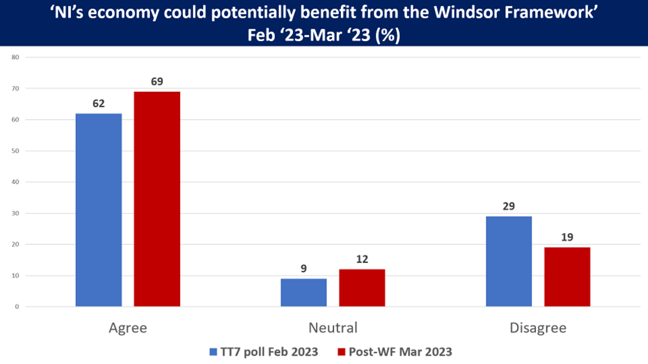 - Compared to our February 2023 poll, we see that the proportion of voters perceiving potential economic benefits from the Protocol with the Windsor Framework arrangements has risen from 62% to 69%; there has been decline among those disagreeing: from 29% to 19%.