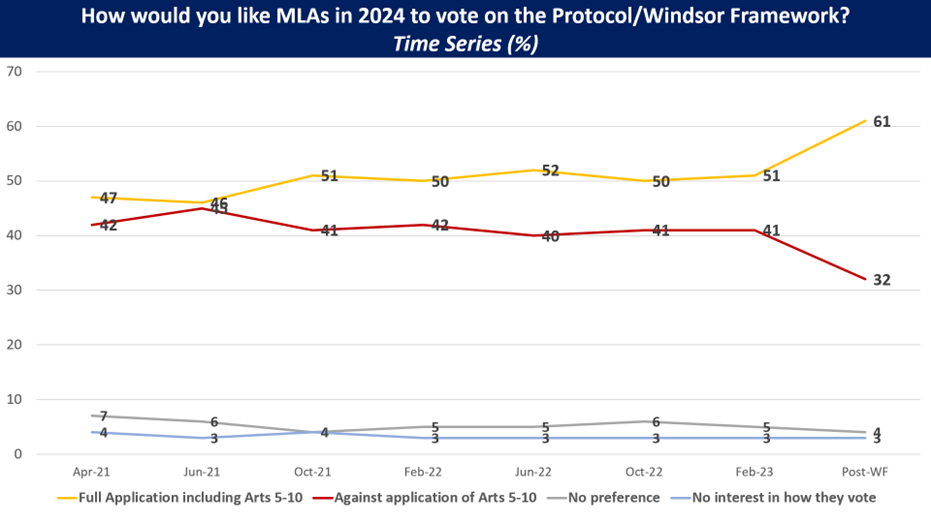 - With the Windsor Framework, 61% of respondents would like to see members of the Northern Ireland Assembly (MLAs) vote in favour of the continued application of the Protocol when they hold their ‘democratic consent’ vote in 2024. This compares with 51% in our last pre-Windsor Framework poll in February 2023.