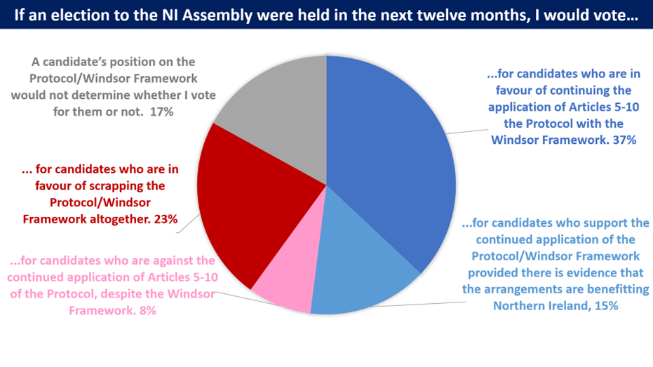- Almost a quarter (23%) will only vote for candidates in the next Northern Ireland Assembly election who are in favour of scrapping the Protocol and/or the Windsor Framework.