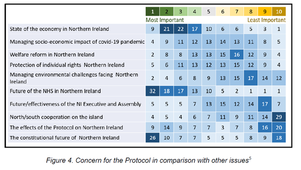 Based on the three issues of most importance to voters, the Protocol is ranked fourth (32% respondents put it in the top three) behind the future of the NHS (67%), the state of the economy (52%) and the constitutional future of Northern Ireland (43%).