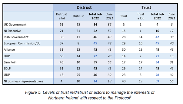 • There are high levels of distrust in political actors and institutions when it comes to managing Northern Ireland’s interest with respect to the Protocol