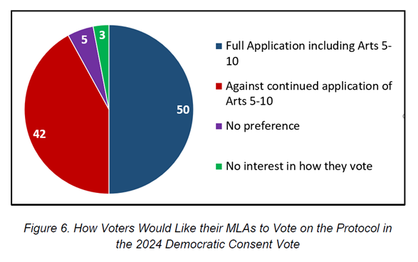 • Half (50%) favour MLAs voting for the continued application of the Protocol; 42% want MLAs to vote against.