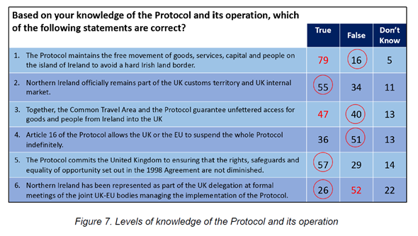 Of the three statements to which a majority responded incorrectly, the most emphatic response was the claim by 79% of respondents that the Protocol maintains the free movement of goods, services, capital and people on the island of Ireland to avoid a hard Irish land border. The statement is false. The Protocol does provide for the free movement of goods on the island of Ireland, but not the other three ‘freedoms’. The partial exception relates to provisions relating to a single electricity market on the island of Ireland. Only 16% of respondents identified the statement as being false.